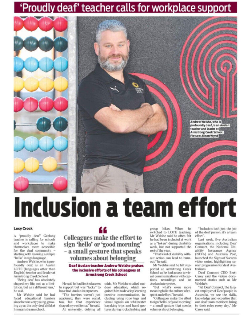 Now, in his role at Armstrong Creek Public school, Andrew is thriving in an environment that recognises Deaf identity – one that listens and adapts to his needs to facilitate a culture of respect and inclusion.